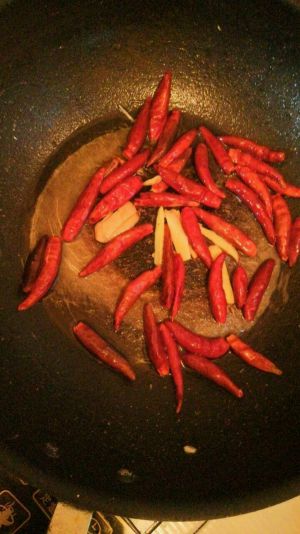 第七步:将干辣椒和花椒一起干煸(煮鱼片时觉得姜放少了,就又加了几片姜进入)