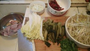 第二步:葱头,姜蒜洗好切好,娃娃菜和酸菜洗好,不要切小片,我都是对半切的,还有黄豆芽,鱼肉洗干净备用