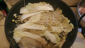 第四步:把酸菜、娃娃菜和黄豆芽依次放入锅里一起炒