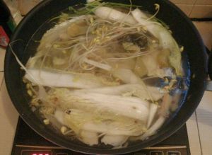 蔬菜(根据自己的喜好放)用水焯一下盛出,把鱼头鱼骨汤(要把鱼头鱼骨煨成浓汤)浇在蔬菜上。