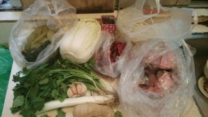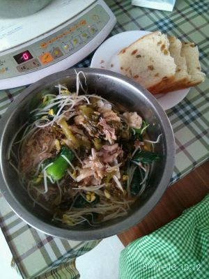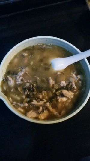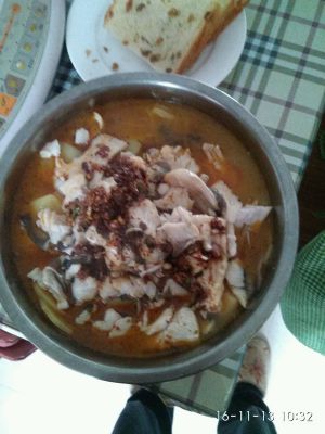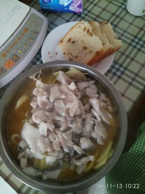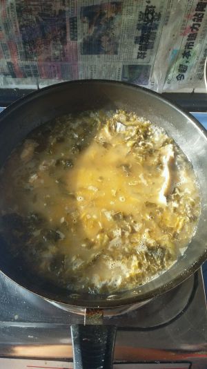 5.鱼头,鱼尾,中段少许油炸熟,下酸菜,一次性放足够的水。煮汤开始了……