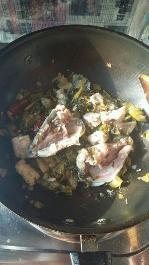 起锅煸炒鱼骨、鱼头,炒至变色加入酸菜包。炒出香味后放入调料包(所有调料都是配好的,特别方便。)