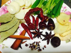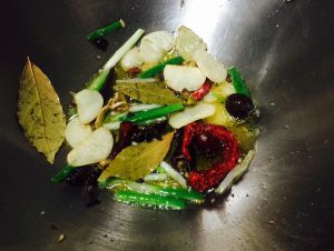葱姜蒜辣椒花椒八角导入翻炒闻到香味