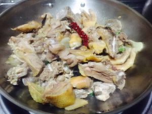 鸡肉放油,姜片,大蒜爆炒焦黄,加入盐,耗油,白糖,酱油
