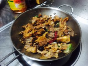 倒入焯好的鸡块翻炒…加入少许盐、酱油、