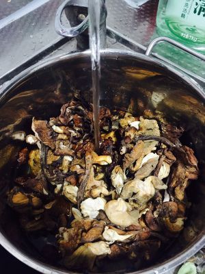 选优质东北野生榛蘑和冻蘑,用水反复清洗,清水泡发半小时左右…在东北,榛蘑炖小鸡最配,但是冻蘑口感也不错哟…