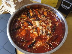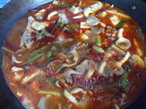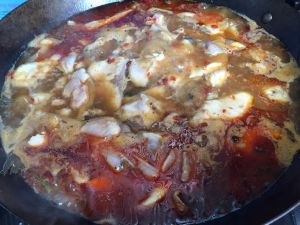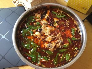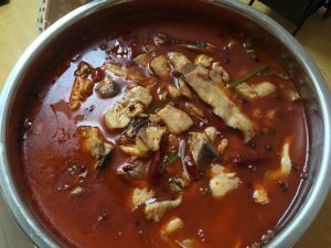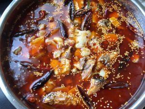 豆瓣酱。火锅底料。葱白 姜末 蒜末 下锅 爆香。加鱼骨一起炒。鱼骨炒上色 加开水。