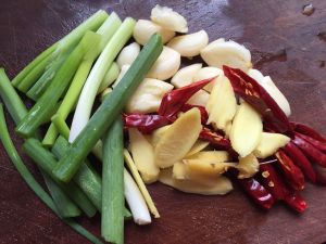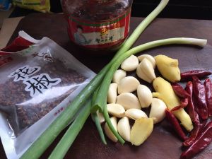 蒜拍一下,葱切段、姜切片、干红辣椒竖着从中间切成两段!