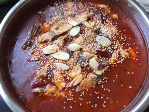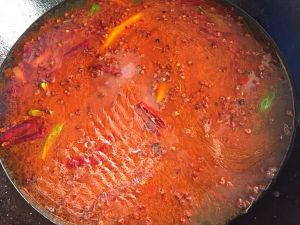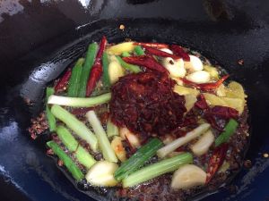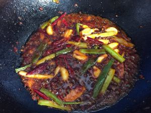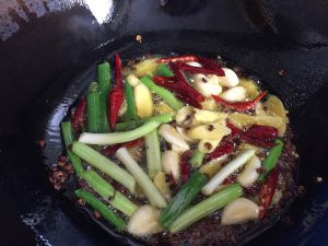 转小火,放入豆瓣酱,再放入少许火锅底料,用锅铲慢慢沿着锅底转圈,这样一会红油就出来了!