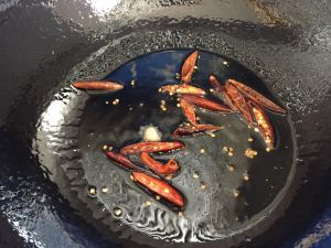 把少许干红辣椒皮放在油里爆香,注意油温不要太高,太高的话辣椒皮会糊的!
