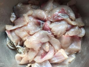 鱼肉。鱼骨。用水冲洗 多冲几遍。清理干净鱼血。然后加盐 胡椒粉 料酒腌制 然后在鱼肉里加蛋白 抓匀。再加淀粉 抓匀 备用。