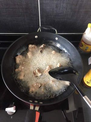 锅内放油,比平时的油多一点,烧热,放入腌制好的排骨,炸成金黄色,再捞出。