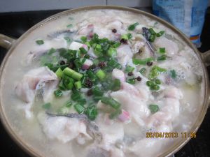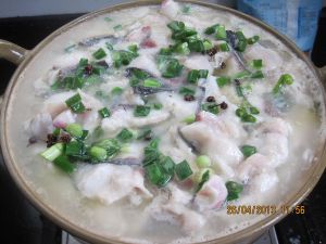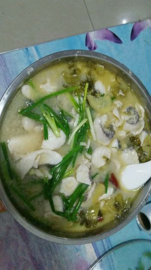 把酸菜炒出香味之后加入三四碗开水,然后先把脊骨加入煮五分钟,(这个步骤忘记拍照了)再放入鱼片煮三分钟。最后加入葱段。就可以装盘啦!可以再淋点热油,香滋滋的酸菜鱼就完成啦!