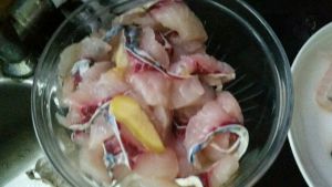 把片好的鱼洗干净之后放几片姜,一点料酒,少许盐腌制几分钟。(料酒个人觉得可有可无)