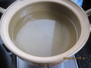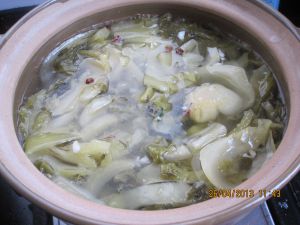 把炒香的酸菜倒入瓦煲内,加盖烧滚