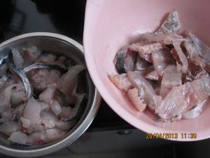 大鱼宰好,切成骨腩和鱼片,分别装起,用油、盐、胡椒粉、料酒、蛋青拌匀,腌一下备用