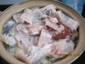 骨腩熟了,把鱼片加在上面,不要动,盖上煲盖,鱼片很快就熟,