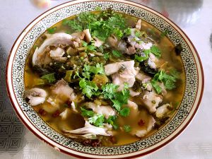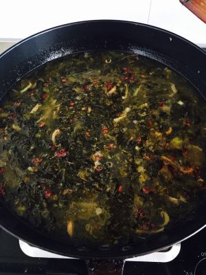 把剥下来的鱼骨用来煮一锅汤,煮沸之后放入酸菜然后加盐和鸡精,我还加了黑胡椒和一些泡椒。然后就是煮啦,差不多5分钟就可以出锅了。