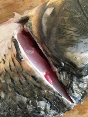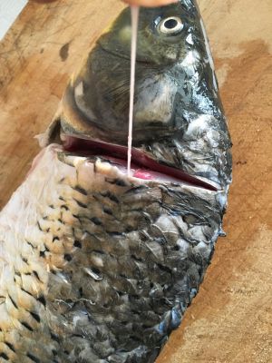 轻轻拍打鱼身几下,鱼皮下有个白色腥线头,慢慢拉出。