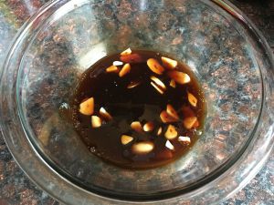 重点制作酱汁,首先倒入生抽,耗油,再加入糖,最后放入切好的蒜瓣,进行搅拌即可