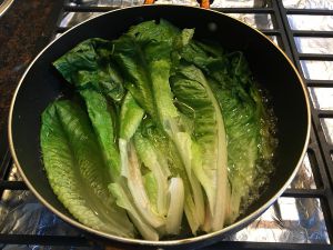 将生菜分批放入锅中用开水抄下,之后将生菜捞出将锅中水倒掉