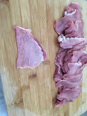 里脊肉切片,入碗,放少许料酒,少许盐,拌匀后腌制一会,具体腌制多少时间,就看各位的备料的速度了