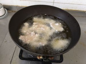 热油炸肉片,一片片下,以防粘黏。