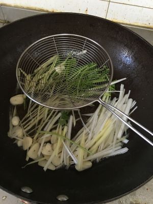 锅内放少许油,葱姜胡萝卜丝翻炒。