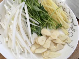 开始备料,大葱切丝,手指长度即可,香菜切段,手指长度即可,姜切丝,看着办的长度即可,大蒜切片,胡萝卜忘买了,也是切丝,手指长度就行。总之一句话,够细够薄就好!