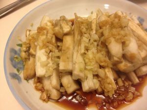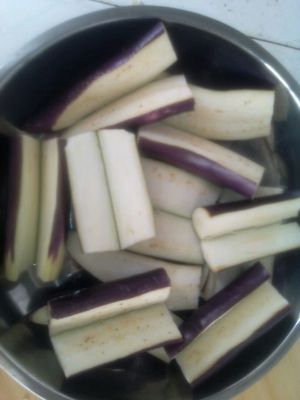 茄子去皮,将茄子切成10cm左右的长条,蒜头,生姜切成末待用。