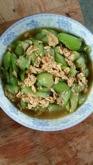 锅烧热放葱花,倒入丝瓜海米翻炒,加入泡海米的水焖至丝瓜变软,放鸡蛋,加盐,翻炒出锅