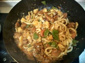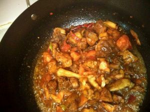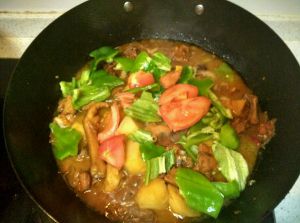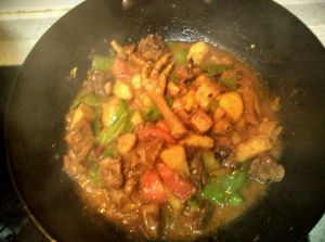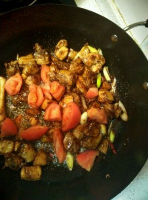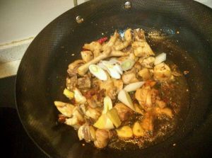 鸡肉八成熟放入土豆,土豆有一点硬心时放入青椒和洋葱,紧张煮,小火