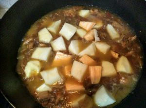 然后倒入熟的比较慢的土豆和胡萝卜,加点水,锅中炖十分钟左右