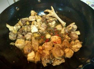将鸡腿肉洗干净,剁成小块,加入料酒、生抽、蚝油、少量老抽 腌制二十分钟