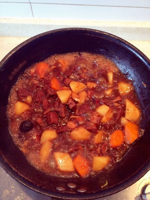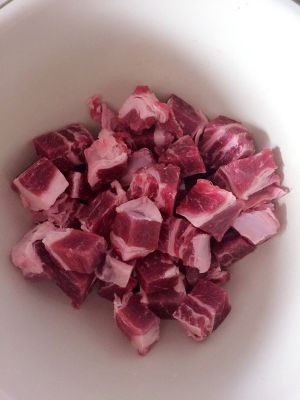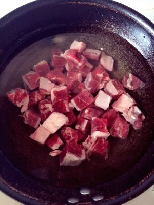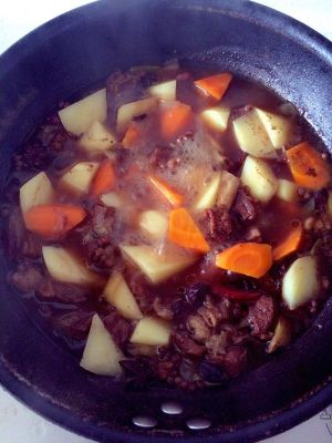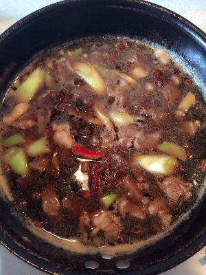 加入牛肉,放水炖至牛肉松软,放入酱油、冰糖。