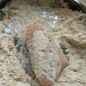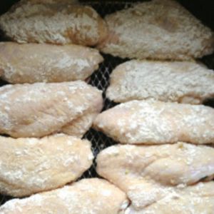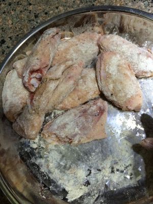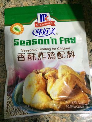 将一袋香酥炸鸡粉倒入盘中,将鸡翅两面粘匀炸鸡粉(我用的是家乐牌)