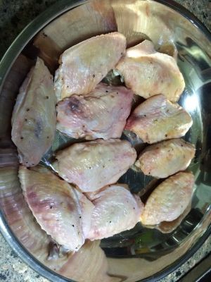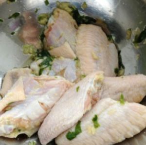 鸡翅10跟,用葱、姜、蒜、盐、糖、料酒、白胡椒粉腌制30分钟入味。