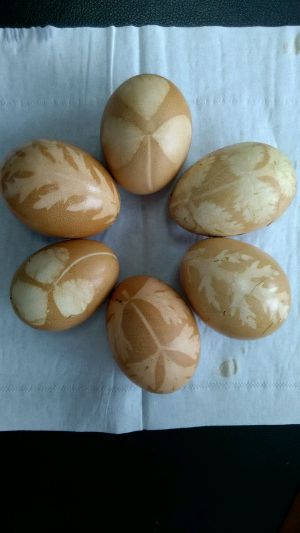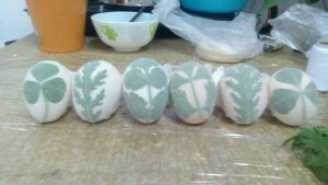 茼蒿叶、芹菜叶、香菜叶、草头洗净,分别贴在鸡蛋上,纱布包好,用棉线固定系好
