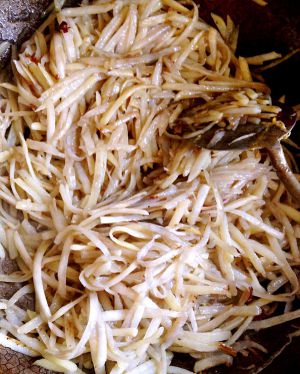 放花椒5-6粒烤焦倒油,入土豆丝翻炒。倒入所有调料炒熟出锅。