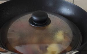 加入八角粉生抽和冰糖调味,盖锅盖转小火焖15分钟,土豆变软汤汁变浓