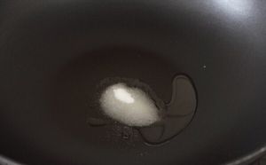 锅里放一汤勺子油,半汤勺子糖。注加一汤匙清水,糖更容易融化