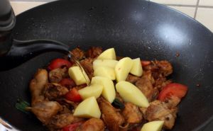 热油爆小红椒蒜姜,加些红油翻炒,再加入鸡肉炒出焦黄色,再加入土豆和水