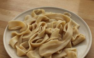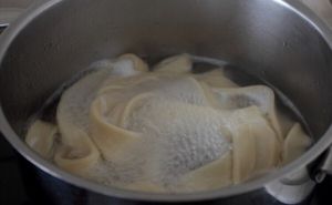 将醒好的面用手捏扁,拉成长条,下入滚水锅中