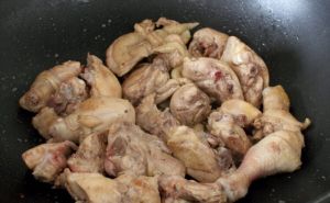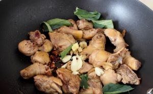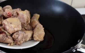 上干锅,中火炒干鸡块的水分,炒出油,然后盛出,洗去污沫备用