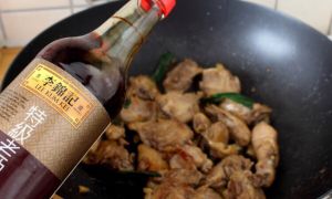 翻炒到鸡块裹上糖色,加入香料:葱姜蒜和花椒。注:据说新疆人这道菜不用八角和桂皮