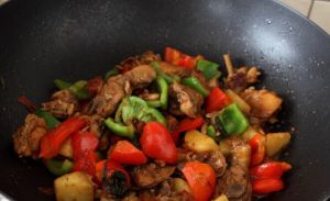 汁水烧的差不多的时候,鸡肉已烂,将切块的青红椒入锅