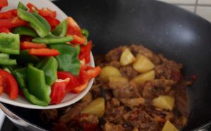 鸡肉熟了土豆面了,就放入切好的青椒,少许酱油,翻炒几下即可出锅!