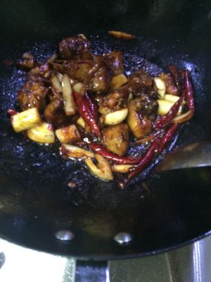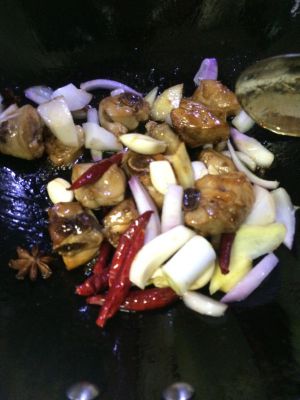 放入大料,干辣椒,大蒜,洋葱,翻炒,炒干鸡块的水份。