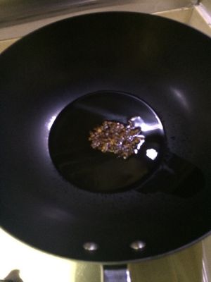 锅里倒油,放入花椒小火慢炸,直到出香味,捞出花椒。