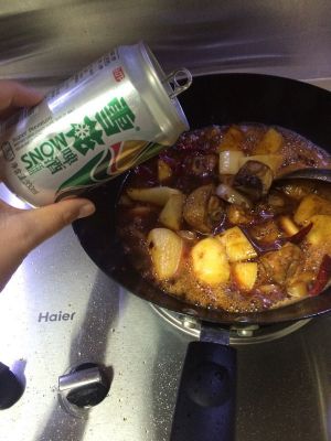 加水没过鸡块,稍多点不要紧。加两瓶盖料酒,一大勺豆瓣酱,半勺老抽,半勺生抽,煮15-20分钟。
